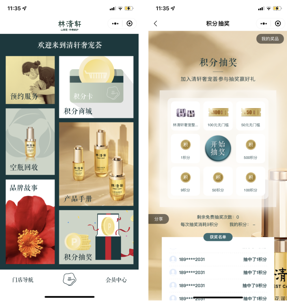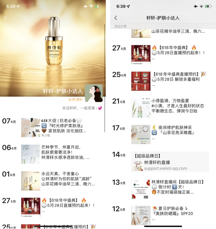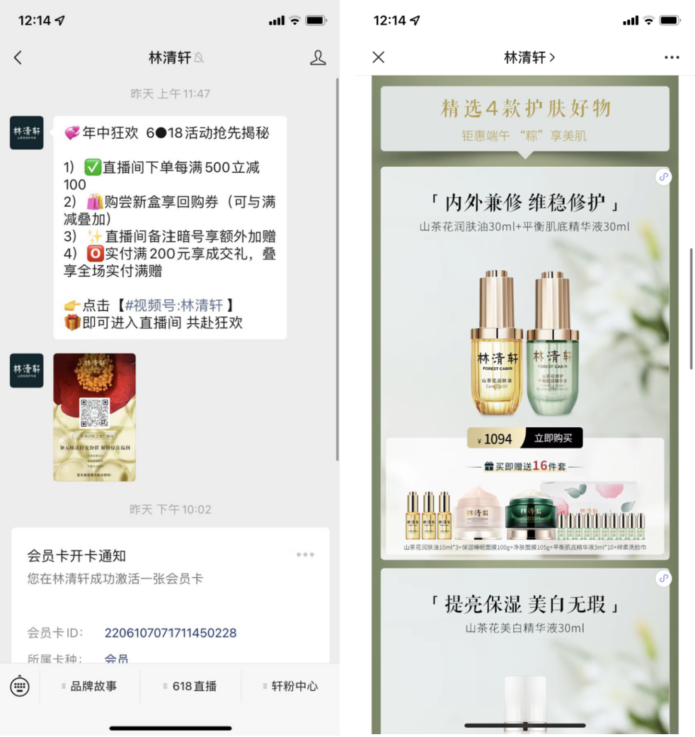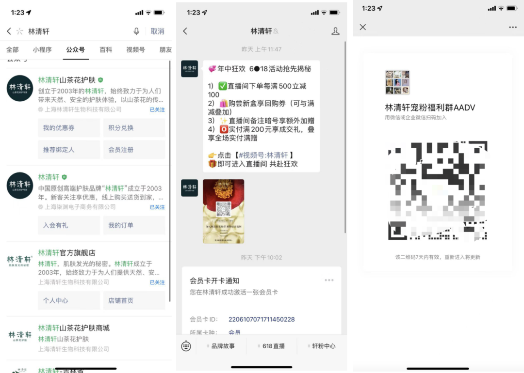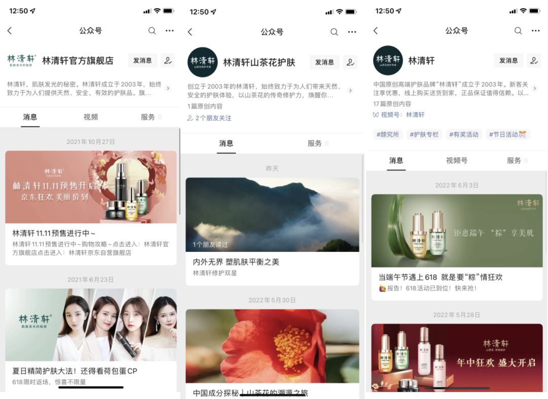 公眾號「林清軒」:主要賬號,作為主要推廣渠道,是私域和會員的重要入口; 公眾號「林清軒山茶花護(hù)膚」:服務(wù)號,內(nèi)容主要為品牌推廣和宣傳為主,有商城和會員的入口; 公眾號「林清軒官方旗艦店」:主要以推廣售賣產(chǎn)品為主;