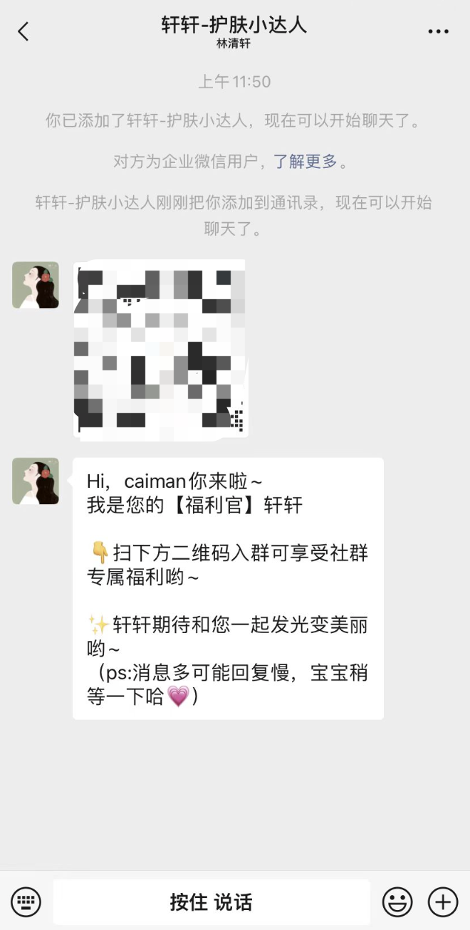 在關(guān)注公眾號后就會推送私域添加入口,具體路徑:公眾號自動回復(fù)語--掃描二維碼--進(jìn)入社群