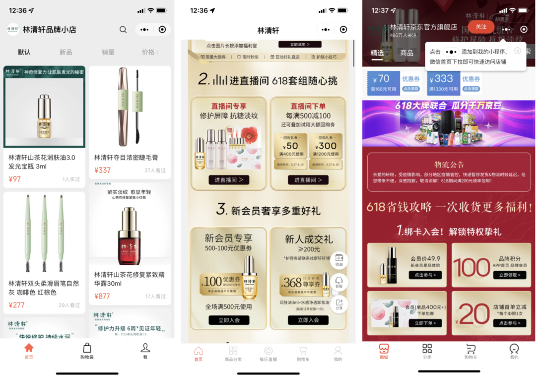 小程序「林清軒」:功能較廣,包含私域引流、商城、會員系統(tǒng)等; 小程序「林清軒京東官方旗艦店」:同步京東商城,便于京東用戶購買; 小程序「林清軒自營旗艦店」:自營產(chǎn)品的商城專區(qū); 小程序「林清軒品牌小店」:細(xì)分產(chǎn)品的商城專區(qū);