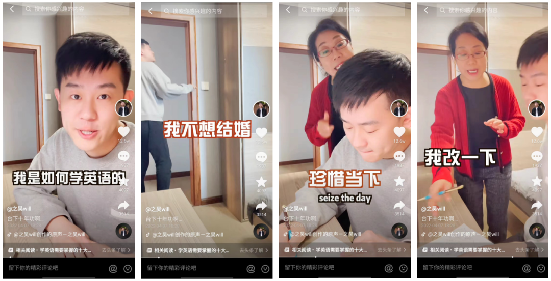 另一位博主@之昊will 的媽媽是英語老師,他和媽媽拍攝的視頻內(nèi)容,都是取材于各種生活細(xì)節(jié),圍繞著英語學(xué)習(xí)展開。