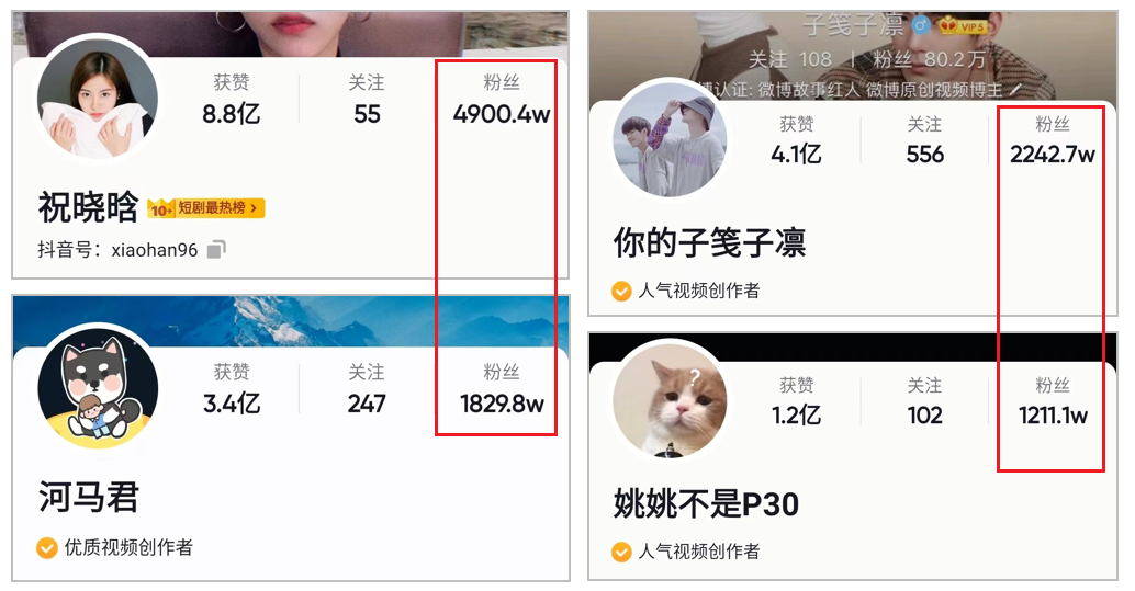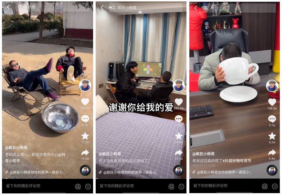 除了@瘋狂小楊哥 之外,和父母互動的視頻還帶火了不少博主,在抖音上,已經(jīng)有不少相同賽道的博主粉絲量過了千萬。
