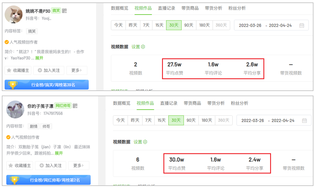 雖然有些視頻的劇本痕跡十分明顯,但并不妨礙用戶對他們的喜愛??梢钥吹?,這些博主的視頻互動數(shù)據(jù)都較為不錯,有的點贊量甚至能達(dá)近 300w 。