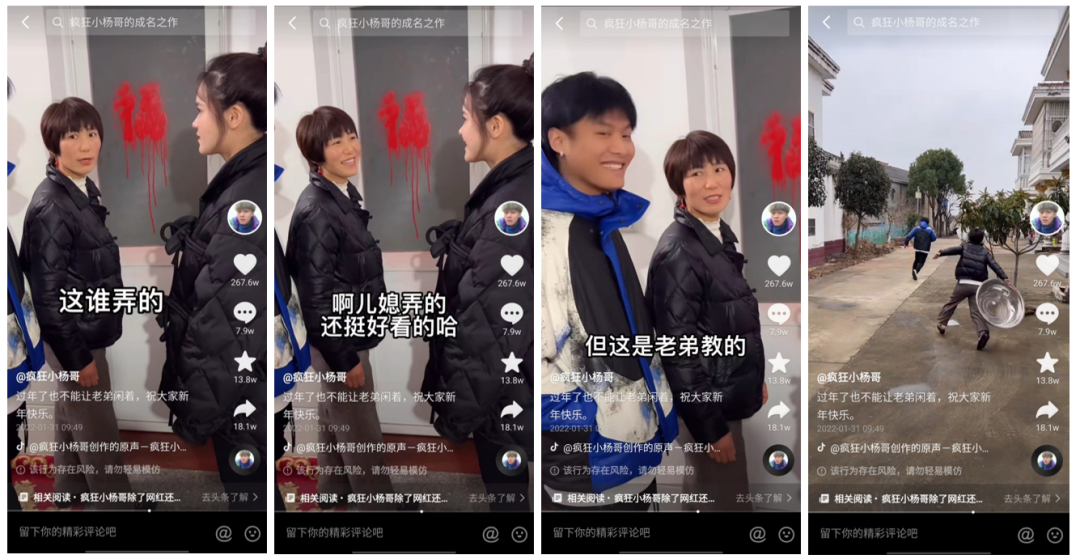 如@瘋狂小楊哥 視頻中有一小段劇情是,門上的“?!弊直毁N壞了,一開始大家相視無言,隨后媽媽生氣質(zhì)問,知道是兒媳婦干的之后,立馬變臉笑著鼓勵。
