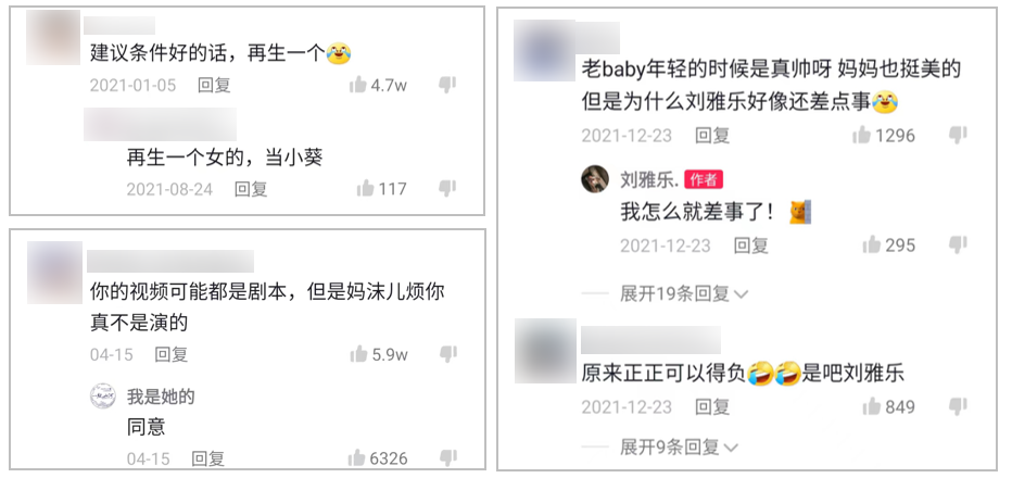 當(dāng)粉絲們感受到父母對博主“嫌棄”的情緒時,還會加入一起調(diào)侃博主的大軍。在視頻的評論區(qū)里,幾個高贊的評論都是粉絲們對博主的“調(diào)侃”,比如“建議條件好的話再生一個”、“媽媽煩你真不是演的”。