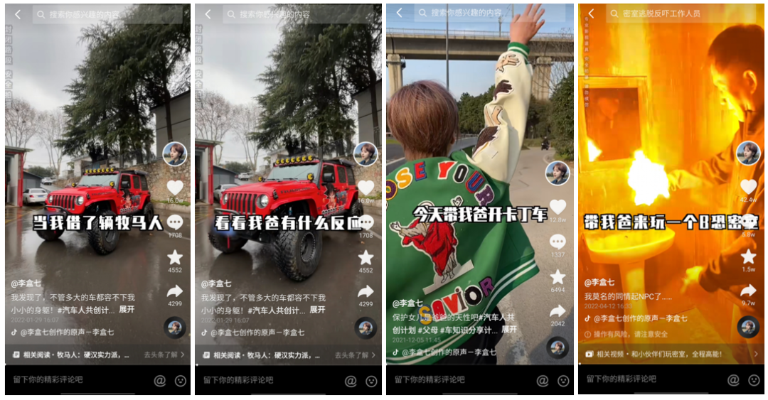 比如愛車的@李盒七 會借來不同的車,和爸爸一起體驗,還會帶著爸爸去玩年輕人玩的娛樂項目,比如開卡丁車、玩密室逃脫等。