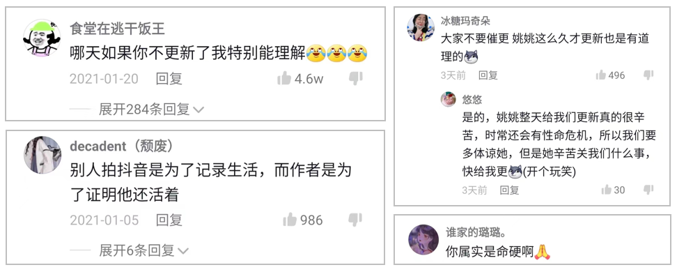 久而久之,粉絲開始在評論區(qū)自創(chuàng)“梗”。比如看到博主被父母“收拾”后,粉絲會表示博主實在是“命硬”、“不更新了也能理解”、“作者拍抖音是為了證明自己還活著”。