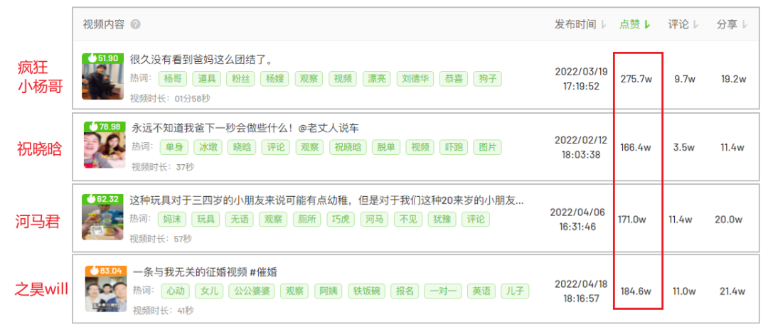 運(yùn)營社發(fā)現(xiàn),父母互動類視頻的轉(zhuǎn)發(fā)數(shù)據(jù)都不錯。@姚姚不是P30 的平均點贊為 27.5w ,平均分享為 2.6w ;@你的子箋子凜 的平均點贊為 30w ,平均分享為 2.4 w 。也就是大約每 10 個點贊的用戶中,就有 1 個人轉(zhuǎn)發(fā)分享。