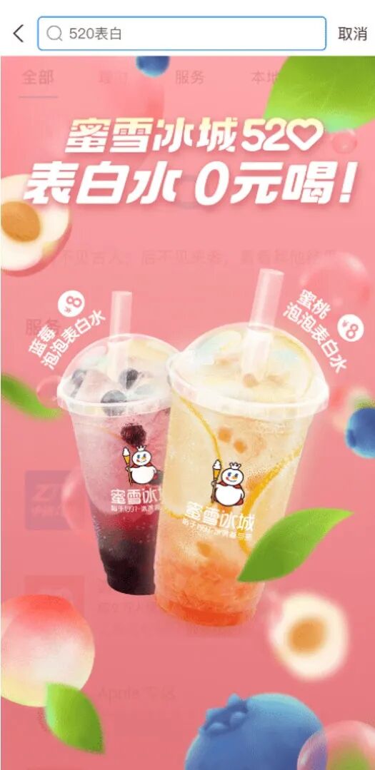 好比蜜雪冰城在 2021 年 5 月 20 日,就在支付寶上配置了搜索詞“ 520 表白”、“蜜雪冰城”,用戶搜索后彈出“蜜雪冰城表白水”的動畫浮層。再配合“表白水 0 元喝”的福利鉤子,吸引用戶進入小程序可領(lǐng)券并在全國門店核銷使用。