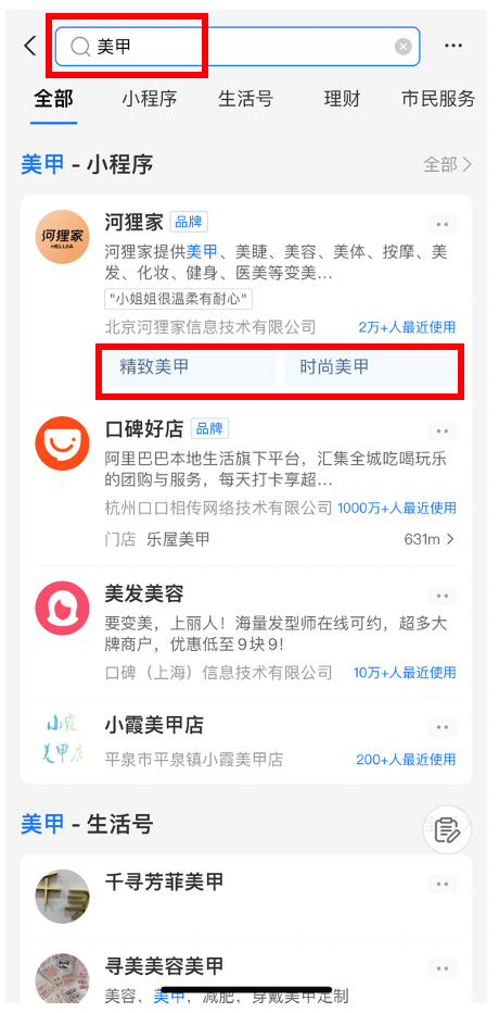 第二種搜索模式則為「服務(wù)」搜索。用戶在支付寶搜索諸如“美甲”、“家政”、“兼職”等服務(wù)關(guān)鍵詞時,搜索頁面將呈現(xiàn)具備相關(guān)服務(wù)功能的小程序。小程序內(nèi)部的服務(wù)功能細分,也會展現(xiàn)在搜索結(jié)果頁,點擊結(jié)果條目即可進入小程序相關(guān)服務(wù)頁面。