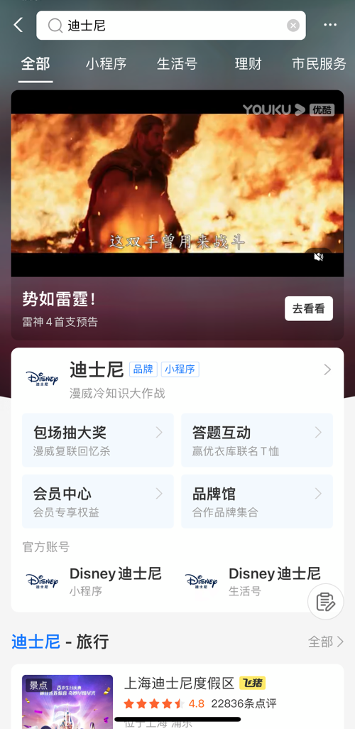 比方說,在《復(fù)仇者聯(lián)盟 4 》公映 3 周年之際,迪士尼就借支付寶的搜索能力,在自家小程序上重啟了漫威宇宙。用戶只要在支付寶上搜「迪士尼」,就能看到屏幕中浮現(xiàn)的 6 顆寶石,然后慢慢匯聚成滅霸的手套,將手機屏幕“震裂”。