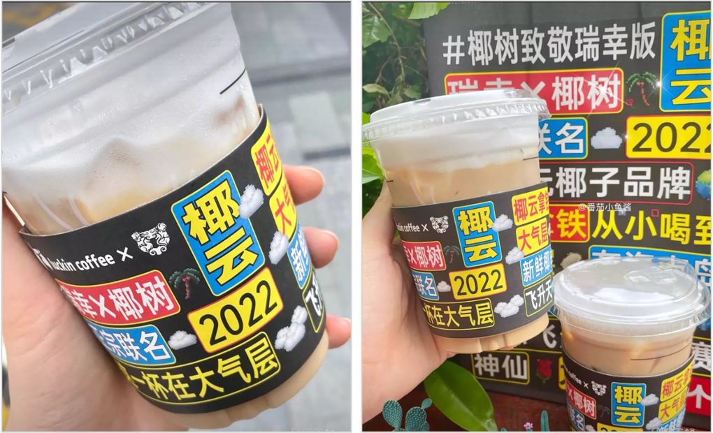 再舉個有“品位”的例子,瑞幸最近和老牌飲料廠「椰樹牌椰汁」聯(lián)名出了一款“椰云拿鐵”,那種“土潮”的混合設(shè)計風(fēng)格,使得產(chǎn)品一上新就火爆全網(wǎng)。