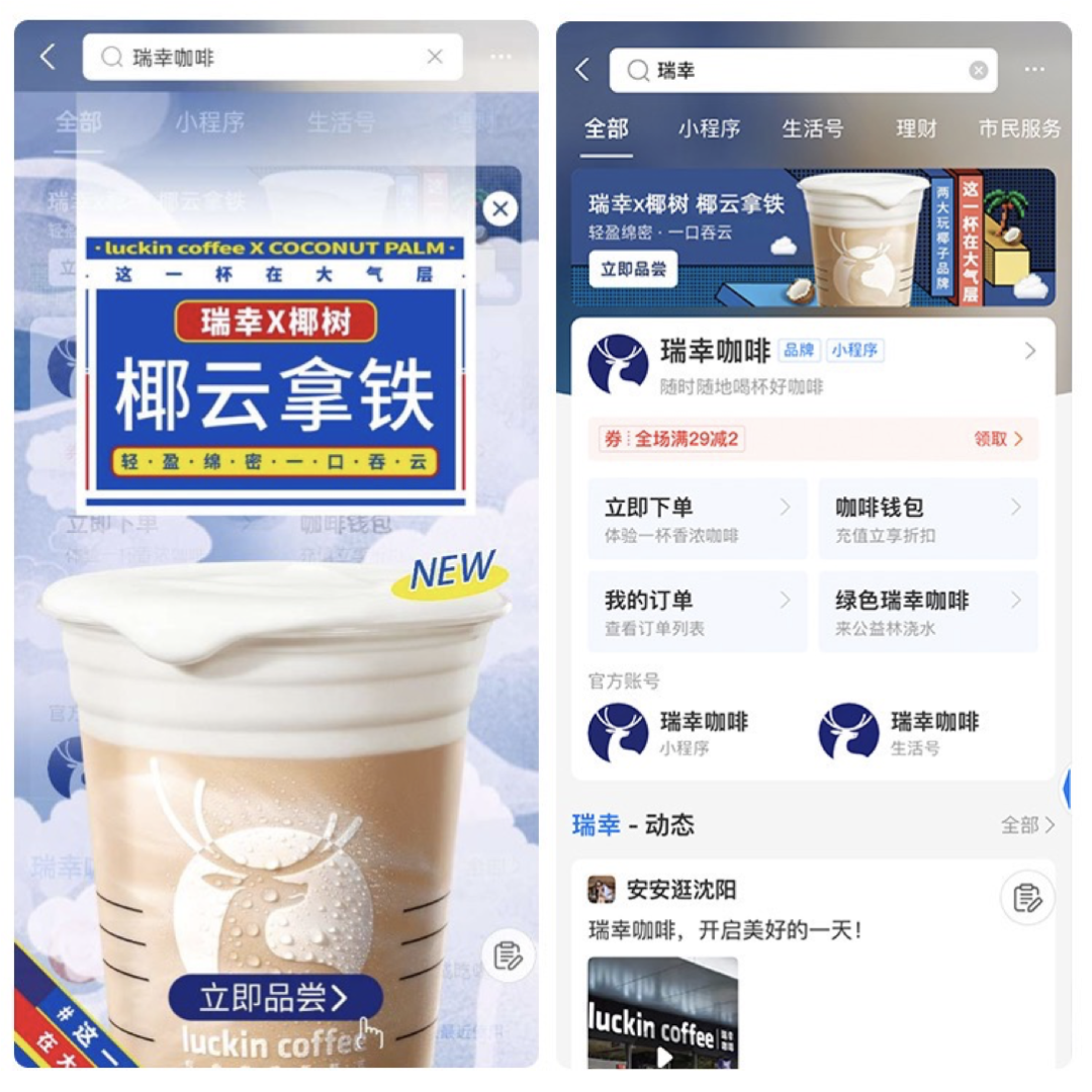 用戶在支付寶第一次搜「瑞幸」,就會彈出小動畫,蹦出一瓶椰云拿鐵,再附帶一句“這一杯是不是在大氣層?”。這一短短滿屏的 5s 動畫,一下子讓把瑞幸這款「新品」帶到用戶面前,著實抓人眼球。