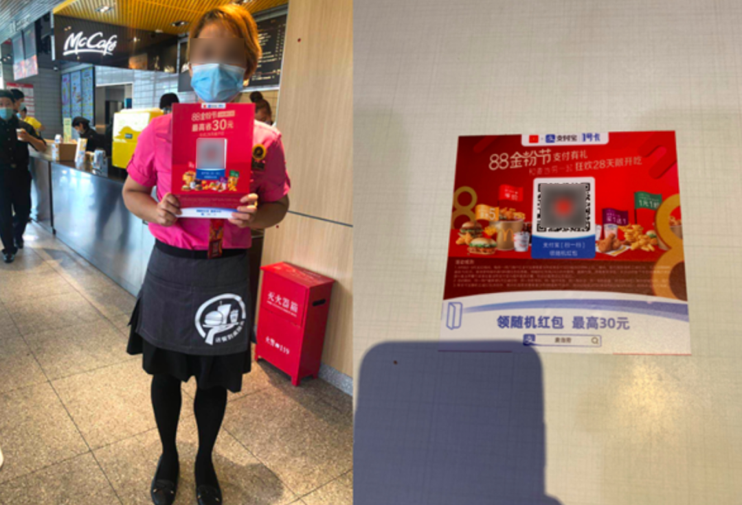 比方說,麥當(dāng)勞就在線下門店,靠引導(dǎo)海報和店員,讓用戶上支付寶搜索“麥當(dāng)勞”,從而引流至私域小程序。