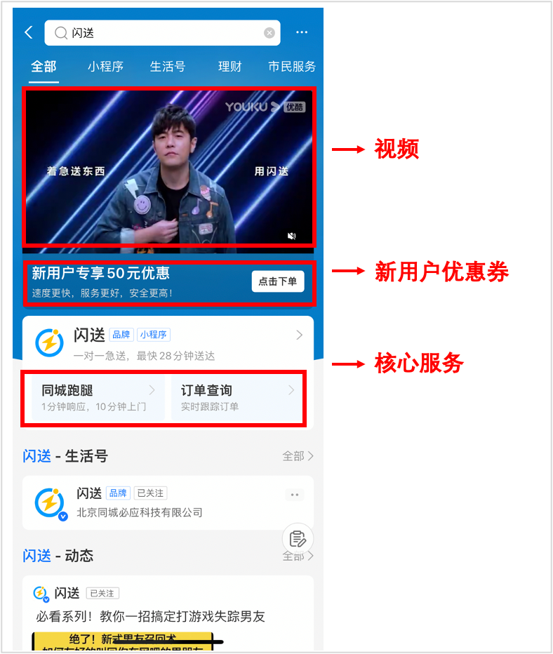 再比如,同城快遞品牌「閃送」也在支付寶上配置了「品牌直達」的功能。用戶輸入“閃送”后,不僅能看到周杰倫給你變魔術(shù)的視頻,還能看到「新用戶專享 50 元」的拉新福利。