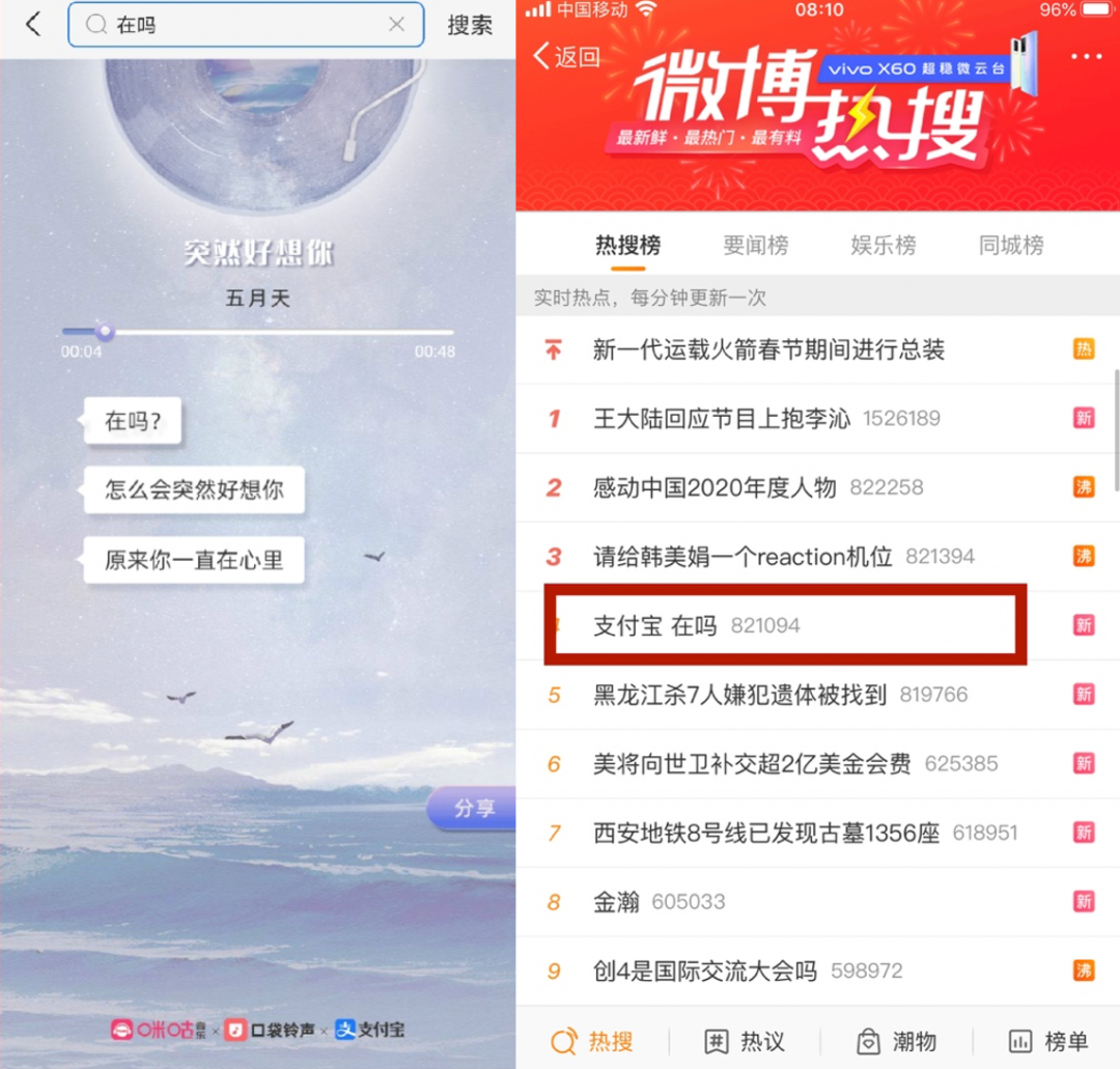 總之,“在嗎”就如同情人節(jié)的音樂盲盒,讓用戶玩了起來,并且#支付寶 在嗎 還沖上了當(dāng)天微博熱搜第四。