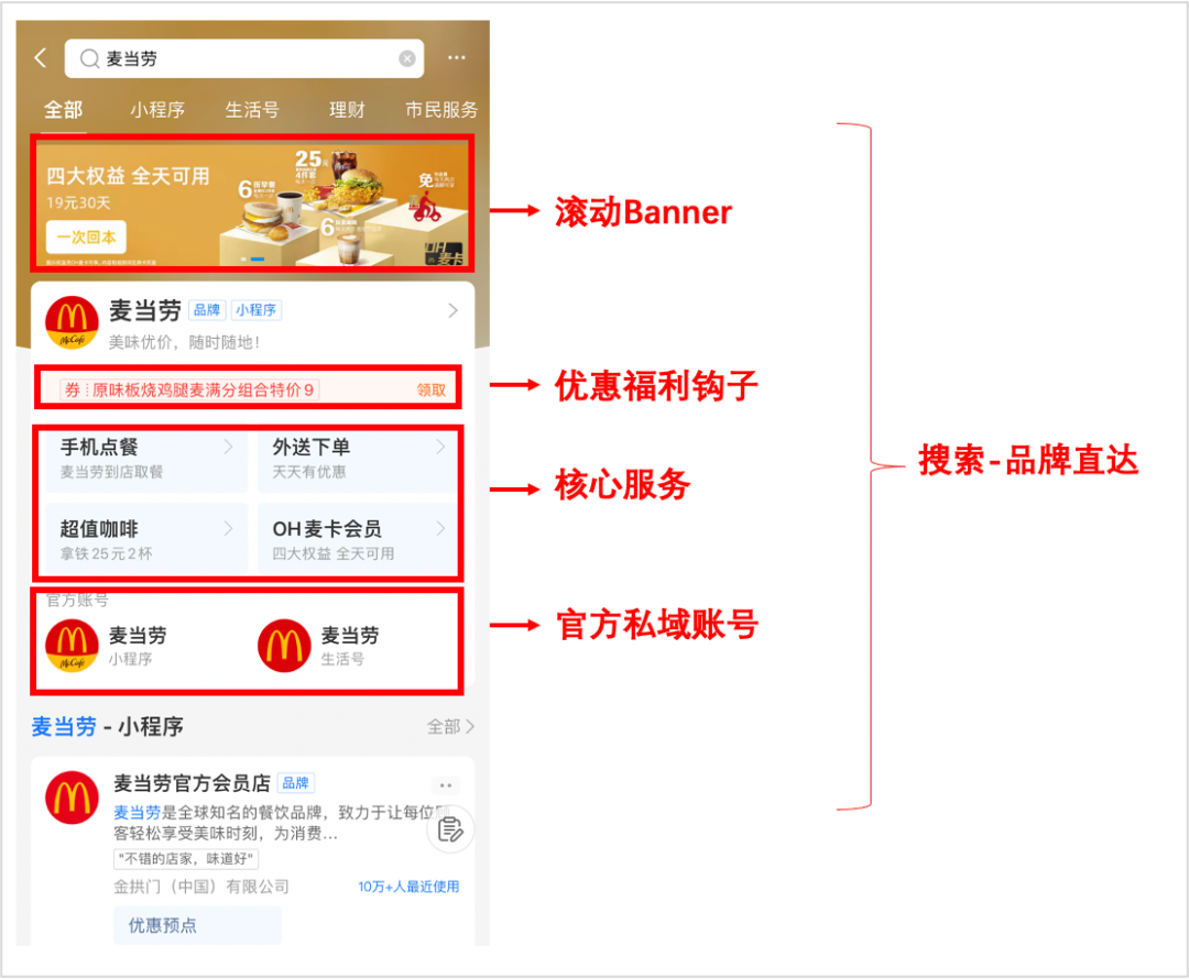 譬如,麥當(dāng)勞就配置了「品牌直達」的功能。品牌設(shè)定“麥當(dāng)勞”關(guān)鍵詞,在搜索結(jié)果頁,從上到下可配置滾動 Banner、領(lǐng)取福利卡券、以及核心功能,包括手機點餐、外送下單、OH 麥卡會員等,還有麥當(dāng)勞的官方私域賬號入口。