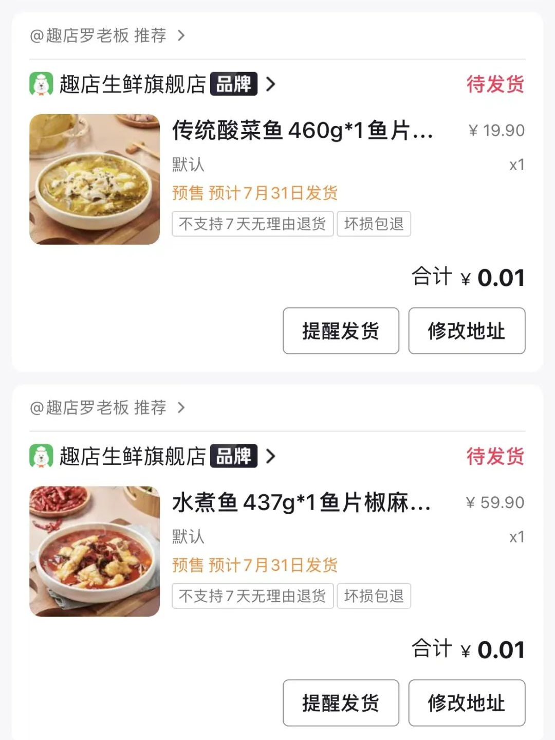 視金錢如糞土的“趣店羅老板”,點(diǎn)燃了圍觀者的消費(fèi)熱情,換來了不俗的銷售業(yè)績。當(dāng)天最火爆的59.9元的水煮魚,銷量超過了100萬。酸菜魚、水煮肉片、啤酒鴨等共9款預(yù)制菜商品,銷售額都超過了千萬。