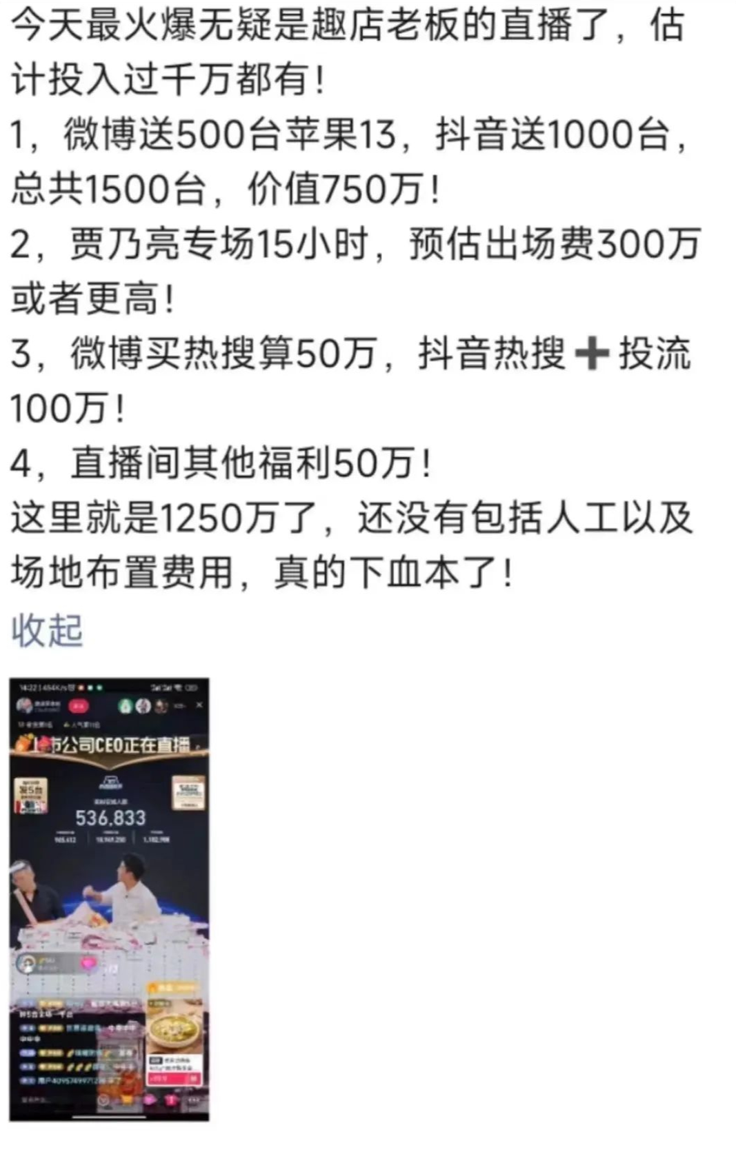 “趣店羅老板”的“鈔能力”還體現(xiàn)在廣告投放上。有業(yè)內(nèi)人士進(jìn)行了成本估算,包括1分錢商品福利、1500臺iPone13抽獎(jiǎng)、傅首爾和賈乃亮的明星出場費(fèi)、平臺的開屏廣告和熱搜等,費(fèi)用高達(dá)1250萬元。