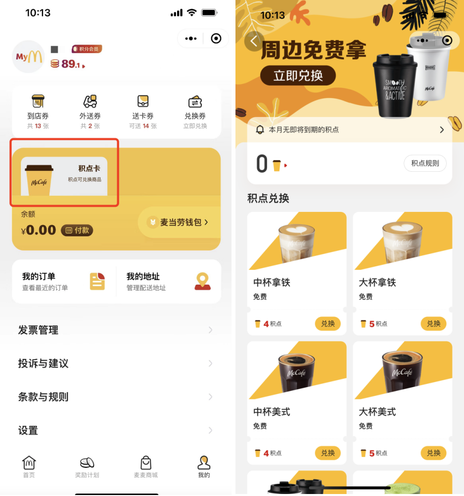 此外,麥當(dāng)勞咖啡還有獨立的積分體系「積點卡」。同樣用戶通過消費獲取積點,積點可以兌換咖啡產(chǎn)品和咖啡杯。
