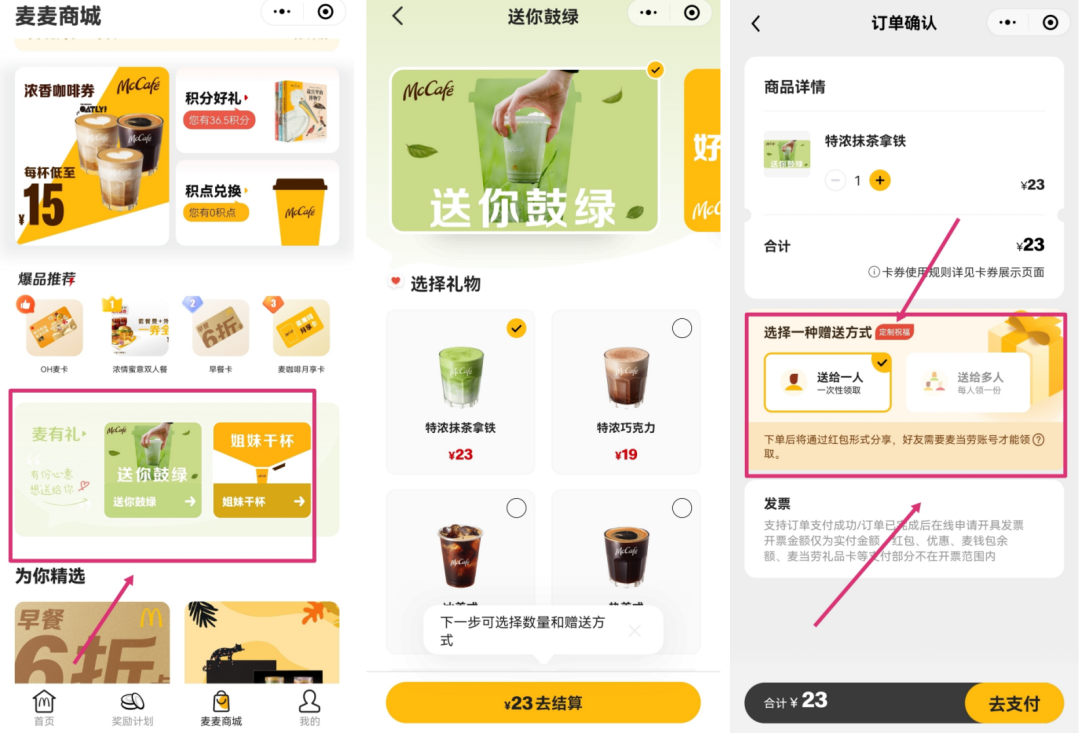 除了付費會員卡,麥當(dāng)勞還專門設(shè)置了飲品類的麥有禮裂變活動,可選擇不同的主題卡片,把飲品贈送給個人或多人。