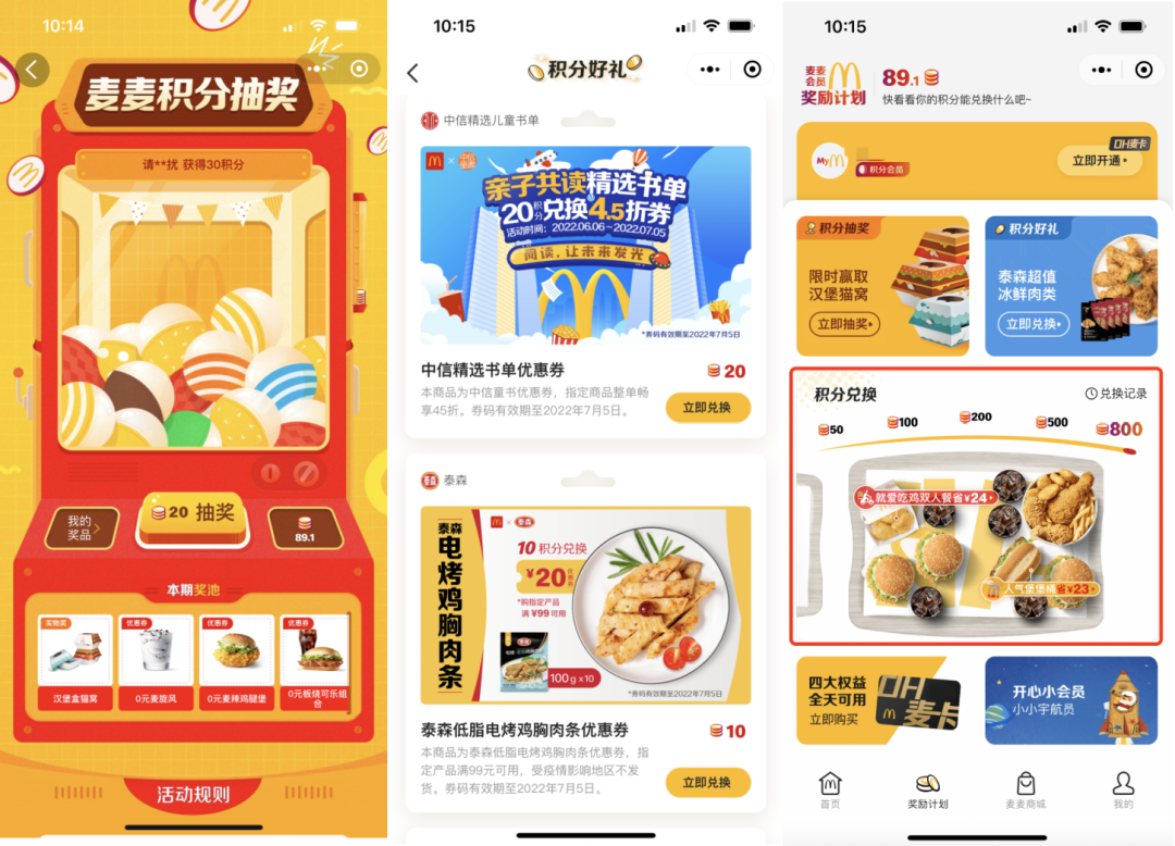 小程序「麥當(dāng)勞」:主要展示福利信息、會員功能、點單服務(wù)、外賣服務(wù)以及積分商城;