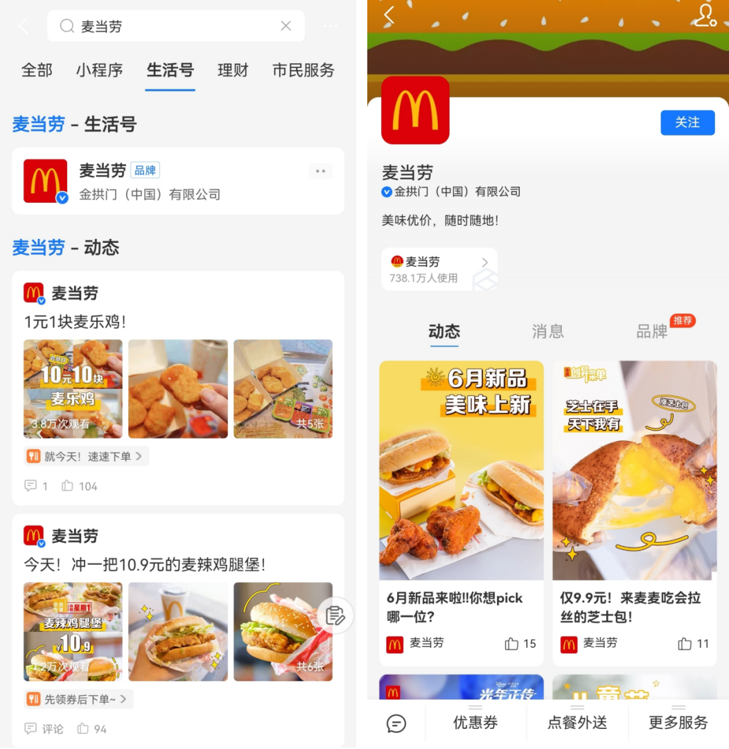 支付寶生活號:麥當(dāng)勞在支付寶還設(shè)置了生活號,目前有738萬人使用過,里面的動態(tài)內(nèi)容主要以新品發(fā)布、活動信息、產(chǎn)品安利為主。
