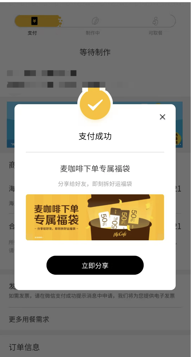 當(dāng)用戶購買麥咖啡系列產(chǎn)品后,平臺會推送優(yōu)惠券裂變的活動,類似于瑞幸咖啡送券的方式,雙方都能獲得優(yōu)惠獎勵。