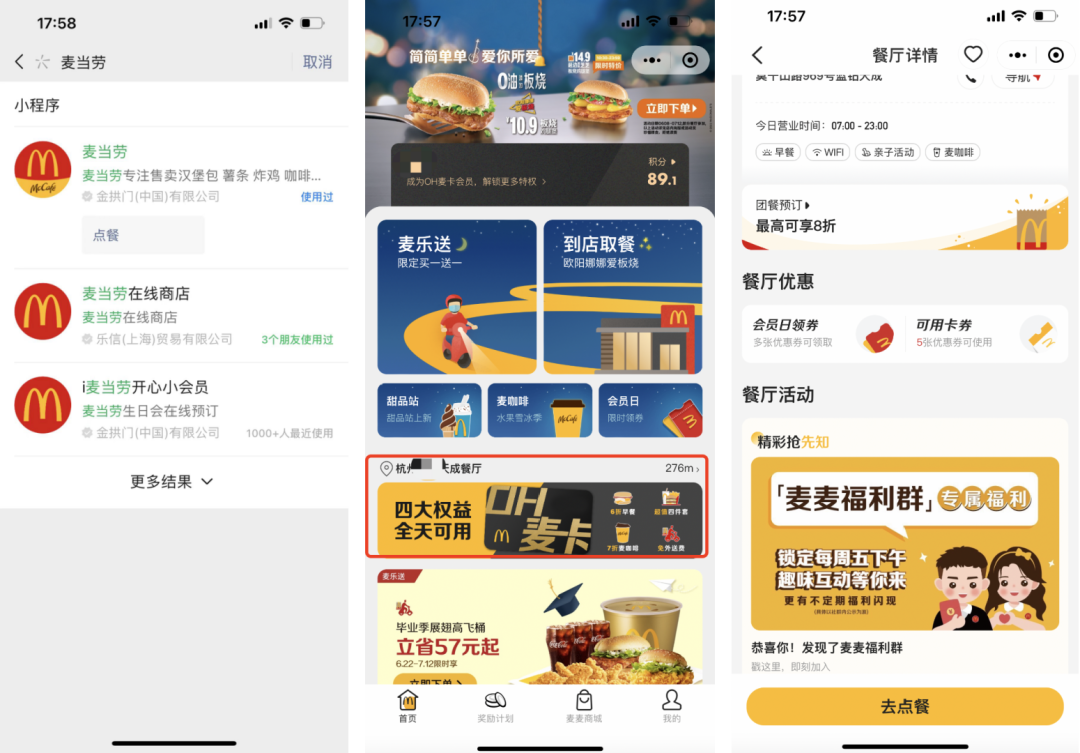 小程序:麥當(dāng)勞有3個小程序,分別有著不同的功能,方便不同需求的用戶使用。如下: