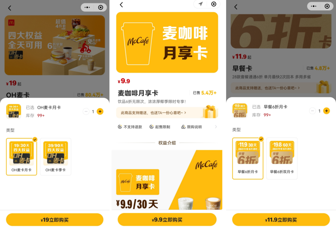 QH麥卡(19和39元,分月卡和季卡):針對購買的用戶,可享受權(quán)益包括超值2件套、6折早餐、7折麥咖啡、免費外送費; 麥咖啡月享卡(9.9元):針對購買的用戶,可享受權(quán)益飲品6折無限次、濃濃厚椰季限時專享; 早餐6折卡(11.9元和19.8元,分1個月和2個月):針對購買的用戶,可享受權(quán)益包括28款套餐統(tǒng)統(tǒng)6折;