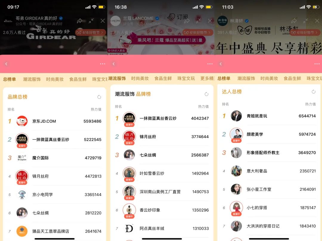 在視頻號(hào)618好物節(jié)的官方榜單上,也可以看到不少服飾品牌、時(shí)尚達(dá)人排名較靠前。