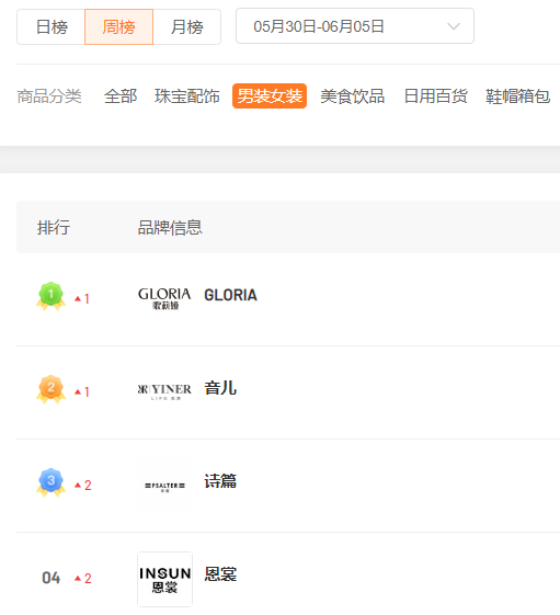 以歌莉婭、影兒集團(tuán)服飾品牌為例,這些品牌商家目前的月均流水都穩(wěn)定在千萬以上,我們?cè)谟淹摹酒放其N售榜】-品牌商品榜周榜中也可以發(fā)現(xiàn),排名前4的品牌為歌莉婭和影兒集團(tuán)旗下的幾個(gè)品牌。