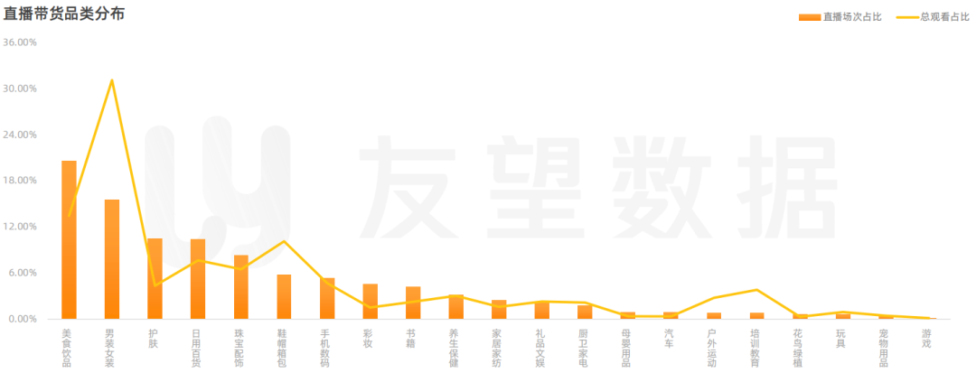 據(jù)友望數(shù)據(jù)【直播數(shù)據(jù)大盤】近7天的數(shù)據(jù)顯示,男裝女裝、美食飲品、鞋服箱包、護(hù)膚、日用百貨等商品的直播場(chǎng)次、銷量占比較多。