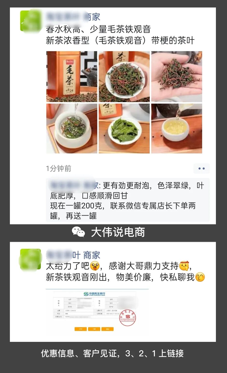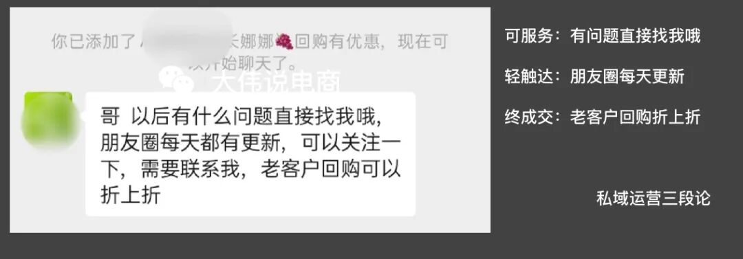 等我把現(xiàn)在這盒茶葉喝完后,碰巧商家的朋友圈推薦了新款茶葉并成功引起了我的注意。我會(huì)迫不及待的直接通過微信與商家取得聯(lián)系,并復(fù)購(gòu)一款他曾經(jīng)在朋友圈發(fā)過的一款茶葉。這貌似與大偉之前在《抖音私域是個(gè)偽命題嗎》中首次總結(jié)和提出的私域運(yùn)營(yíng)三段論:輕觸達(dá)、可服務(wù)、終成交。