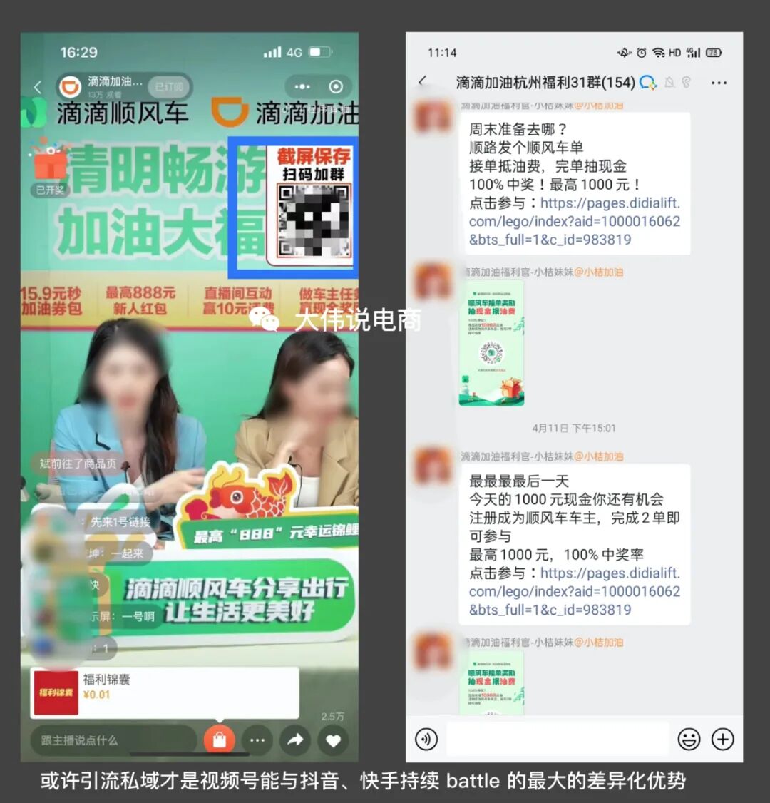 再再比如,滴滴加油站,在視頻號(hào)的直播間直接掛社群二維碼,引導(dǎo)用戶最終沉淀到私域。
