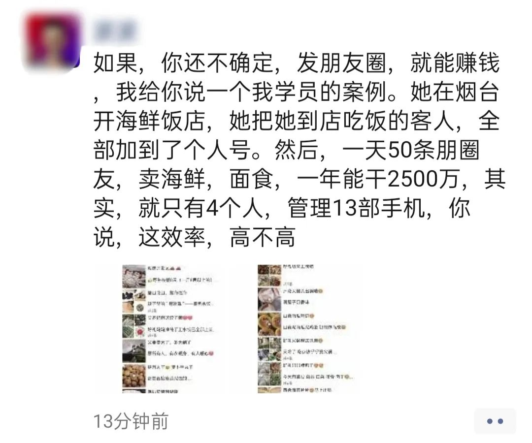 2.3 運(yùn)營(yíng)、轉(zhuǎn)化:我個(gè)人理解,轉(zhuǎn)化是發(fā)生在日常的精細(xì)化運(yùn)營(yíng)之中的,謂之:潤(rùn)物細(xì)無聲。只要精細(xì)化運(yùn)營(yíng)到位,轉(zhuǎn)化自然就水到渠成。由于商家目前沒有微信群,目前商家主要是,通過朋友圈去生產(chǎn)內(nèi)容,傳遞價(jià)值甚至打造人設(shè)。而且商家客戶和我打招呼的第一句話也重點(diǎn)提到“朋友圈”。