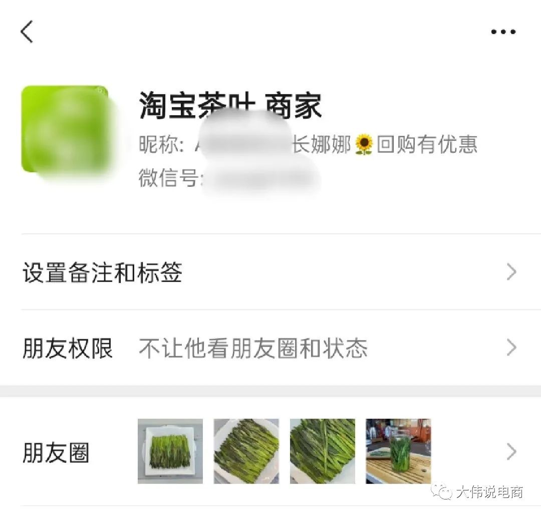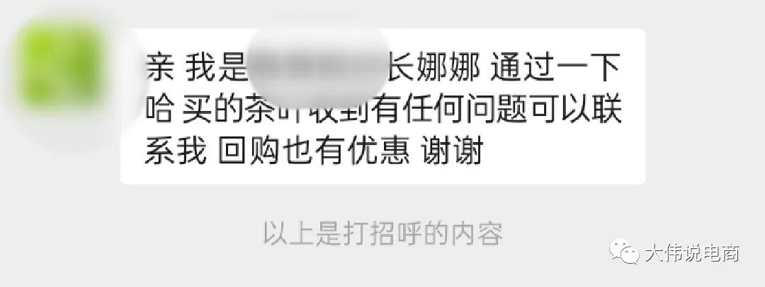 雖然有回購(gòu)、茶葉等關(guān)鍵字,但并沒有淘寶商家這樣的關(guān)鍵字。關(guān)鍵是由于我當(dāng)時(shí)并沒被商家添加微信的心理預(yù)期,所以,我就有點(diǎn)疑惑,我的第一反映還是很莫明其妙:茶葉商家?(由于我運(yùn)營(yíng)了幾個(gè)短視頻達(dá)人賬號(hào),最近確實(shí)在考慮找找看有沒有合適的供應(yīng)鏈廠家搞搞直播帶貨,但也并不是茶葉垂類?。?。個(gè)人信息又被哪個(gè)不良商家給賣了???于是乎,當(dāng)天,我選擇了忽略,并沒有通過它的好友申請(qǐng)。到了下午,我忽然想起來,前兩天在淘寶上買了一盒茶葉,是不是那個(gè)商家呢?OK,本著好奇和學(xué)習(xí)淘寶商家是如何運(yùn)營(yíng)私域的求知欲,我隨即就通過了商家的微信好友請(qǐng)求。