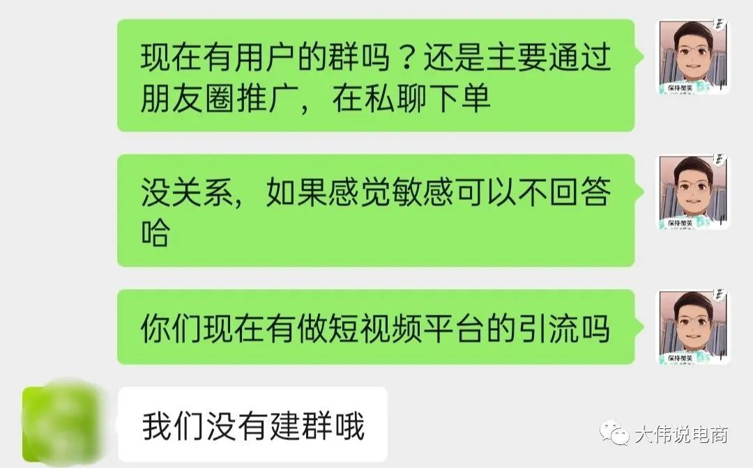 亦或收到對(duì)方的消息時(shí),我的感受就是:對(duì)方又在群發(fā)了,而且我不想回這種消息。SO,我猜測(cè),老板可能是給每個(gè)客服人員單獨(dú)配置了一個(gè)或多個(gè)用于私域運(yùn)營(yíng)的個(gè)人微信號(hào)。企業(yè)微信的確,在某種程度上,會(huì)提升運(yùn)營(yíng)效率。但,轉(zhuǎn)化率這一環(huán)節(jié)也必然會(huì)受到一定影響。商家暫時(shí)沒有對(duì)應(yīng)的微信社群,不太清楚后續(xù)是否建立社群。