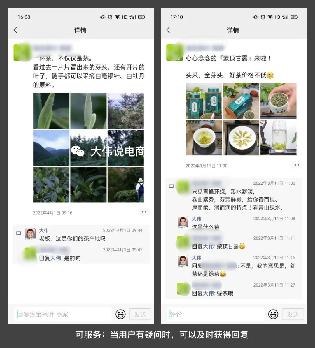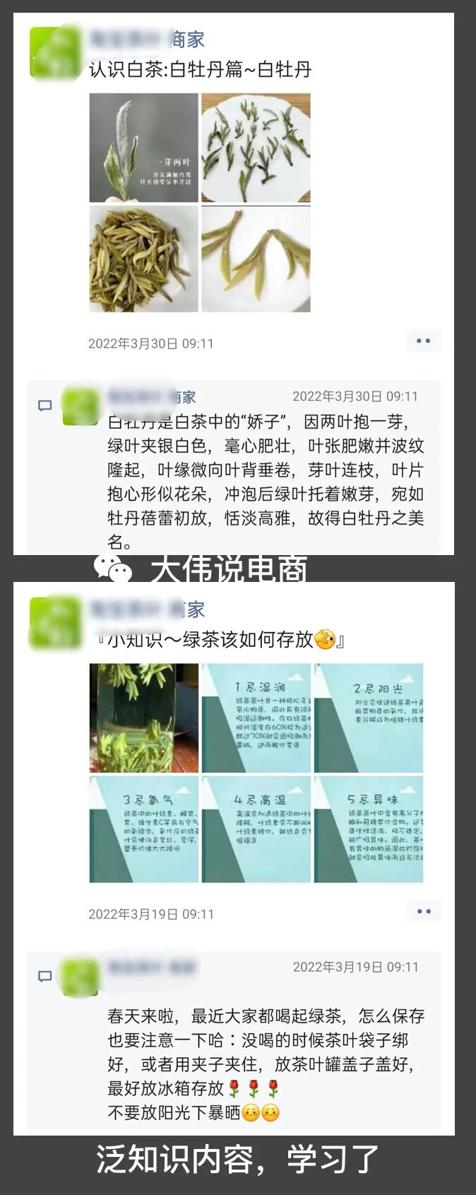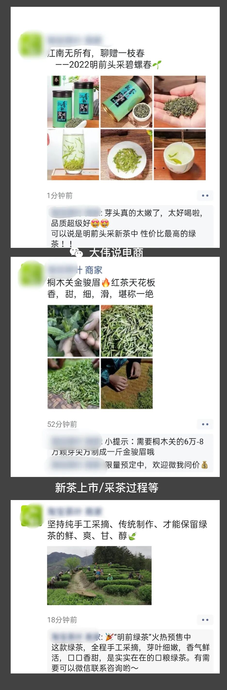 這意味著,朋友圈的內(nèi)容就是商家私域精細(xì)化運(yùn)營(yíng)的落地。當(dāng)我在朋友圈持續(xù)消費(fèi)商家推文的內(nèi)容的時(shí)候,其實(shí)就是一個(gè)被靜默種草、增加信任的過程。我簡(jiǎn)單統(tǒng)計(jì)了一下,這位商家老鐵,每天 3-5 條的朋友圈推文,主要由以下三類內(nèi)容組成:A.新茶上市/采茶過程;