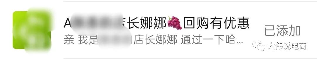沒想到,緊接著第二天,商家就通過下單手機(jī)號(hào)(有的用戶,手機(jī)號(hào)不一定是微信號(hào))添加我的微信好友申請(qǐng)。微信昵稱還是以 A 字母開頭,一股濃濃的微商 style:【A茶葉商家店長(zhǎng)娜娜 回購(gòu)有優(yōu)惠】;備注是:【親,我是店長(zhǎng),通過一下哈】。