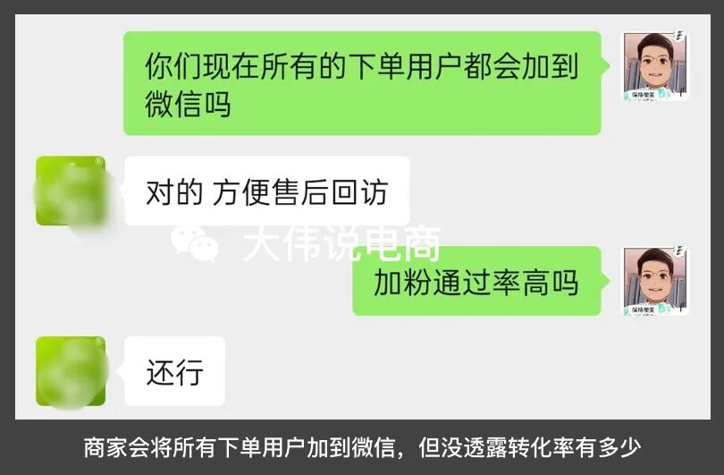 而添加用戶的微信,則是商家主動(dòng)出擊的表現(xiàn)。其實(shí)我更想知道的是,他們的加用戶的微信通過率能達(dá)到多少,也可能商家覺得這個(gè)數(shù)據(jù),過于敏感,只是回復(fù)我說:還行吧。