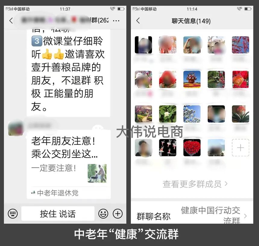 可能有老鐵會(huì)說,我上面提到的都是年輕用戶群體,或者說存量用戶,不能代表中老年用戶這個(gè)龐大的增量用戶群體啊。我姑姑最近加上了好幾個(gè),社區(qū)附近的賣保健品的商家群(群的運(yùn)營(yíng)者是年輕人),群內(nèi)都是附近的老頭老太太。
