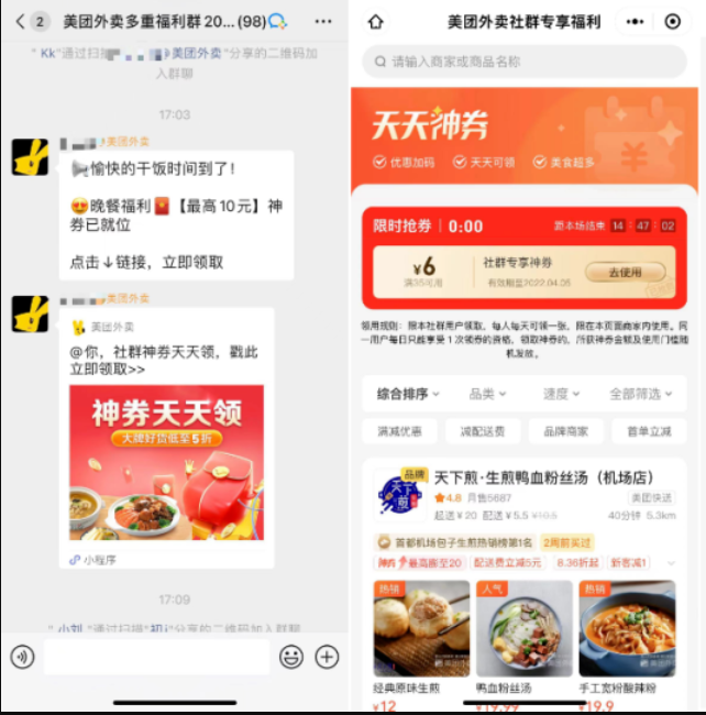 群內(nèi)會(huì)發(fā)放美團(tuán)外賣社群專享福利優(yōu)惠券。