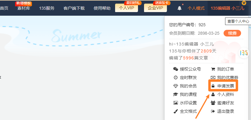 選中編輯器右上角用戶名處,出現(xiàn)菜單欄選擇【申請發(fā)票】即可。