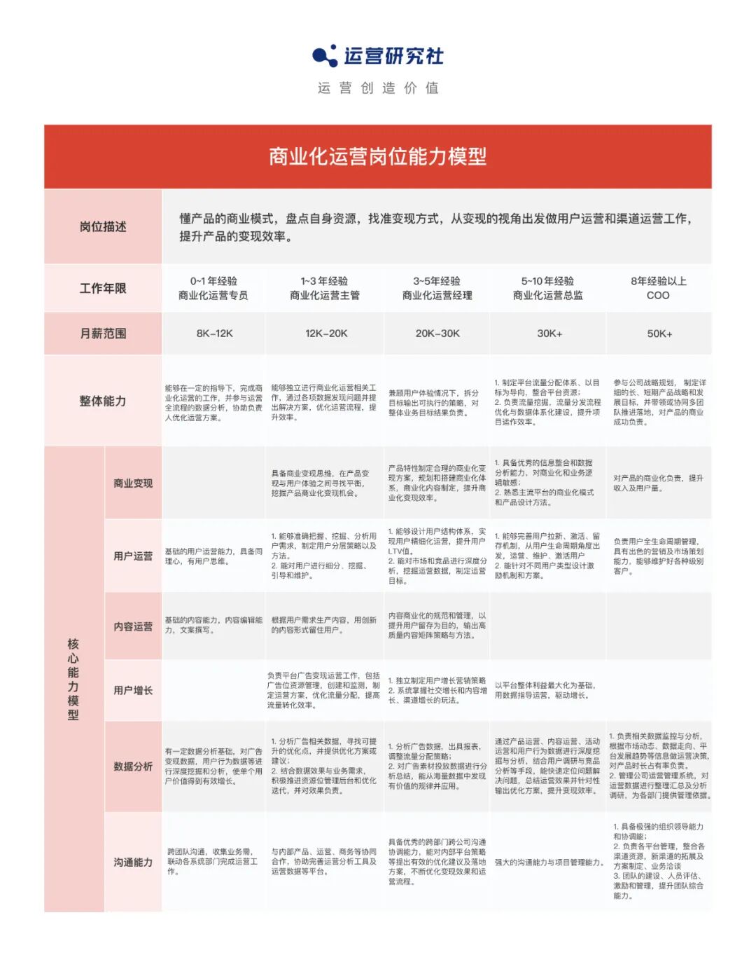 同時(shí),運(yùn)營(yíng)研究社對(duì)具有不同年限工作經(jīng)驗(yàn)的商業(yè)化從業(yè)者的薪資范圍、崗位要求以及核心能力模型進(jìn)行了深度分析。