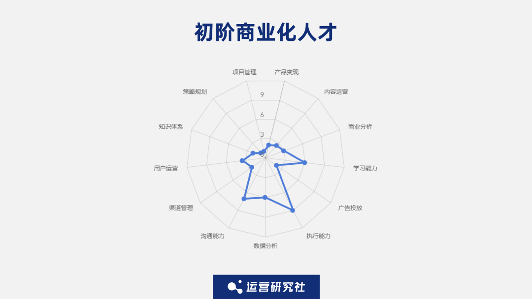 對(duì)于初階商業(yè)化人才來(lái)說(shuō),能夠做好被安排的一般性工作,需要具備一定的邏輯思維能力以及基礎(chǔ)的數(shù)據(jù)處理與分析的能力,輔助運(yùn)營(yíng)負(fù)責(zé)人做決策。