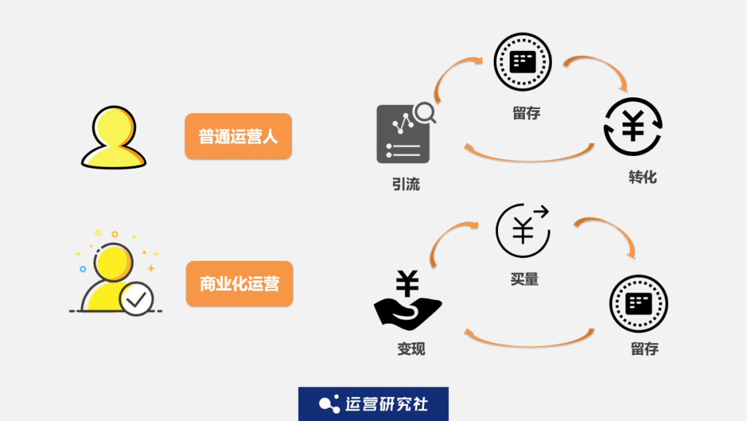 普通運(yùn)營(yíng)人:引流→留存→轉(zhuǎn)化 商業(yè)化運(yùn)營(yíng):變現(xiàn)→買量→留存