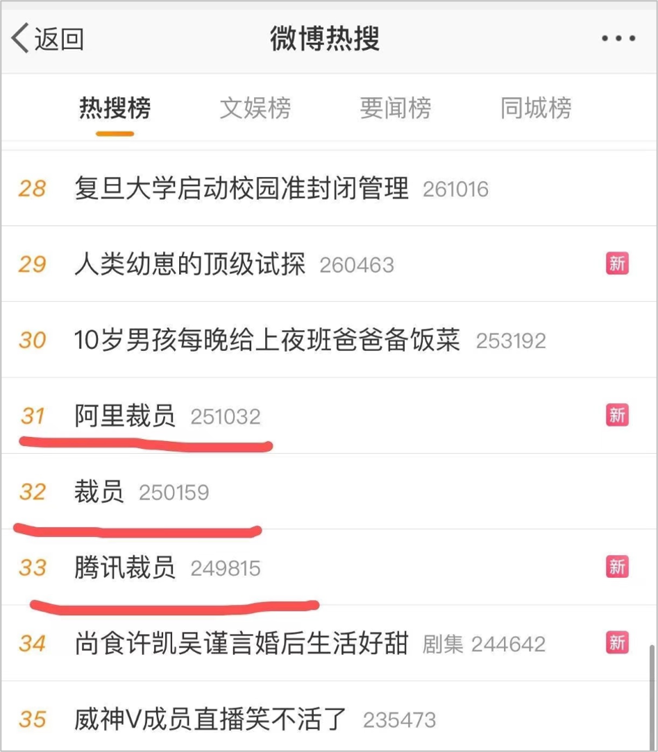 滴滴在 2 月被曝裁員,裁員比例占到總體的 20%;百度在 3 月發(fā)布財(cái)報(bào)后,被爆開始了員工的績(jī)效優(yōu)化,阿里、騰訊裁員的消息更是登上了微博熱搜。