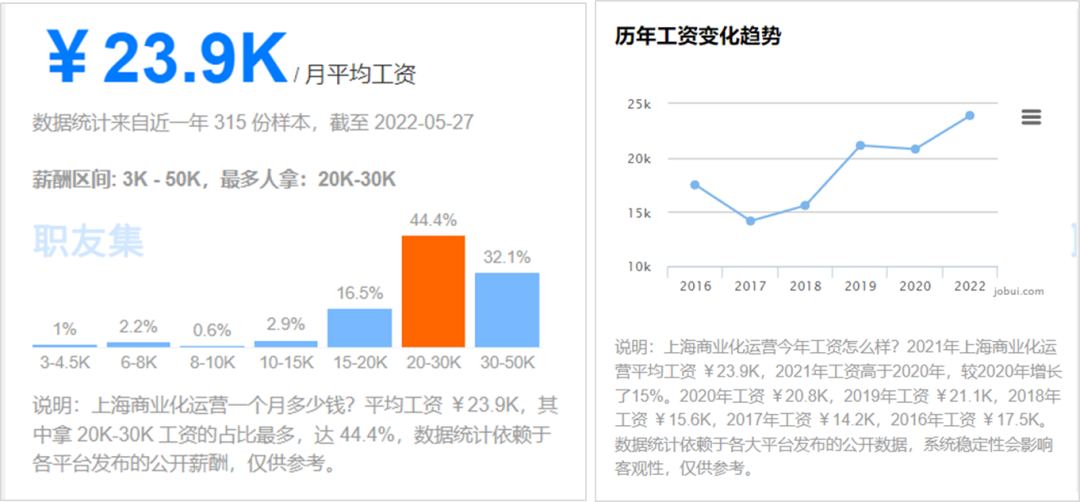 從目前市場(chǎng)上掛出的商業(yè)化運(yùn)營(yíng)崗位薪資來(lái)看,商業(yè)化人才的薪資情況也是非常有競(jìng)爭(zhēng)力的,平均薪資高達(dá) 20K+,并且歷年工資變化趨勢(shì)呈上升狀態(tài)。