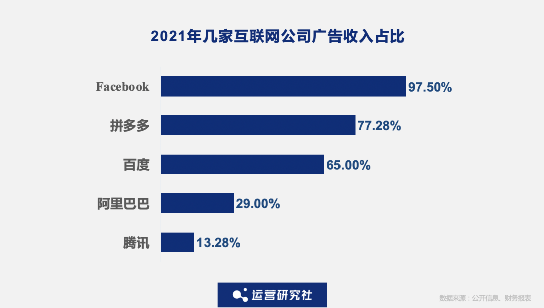 目前,APP 移動(dòng)應(yīng)用平臺(tái)的商業(yè)模式,主要是兩種,一種是流量廣告變現(xiàn),一種則是流量服務(wù)變現(xiàn)。其中,廣告變現(xiàn)是移動(dòng) App 主流的變現(xiàn)模式,幾家典型的互聯(lián)網(wǎng)公司廣告收入占比都非常高,比如Facebook達(dá)到 97.5%。