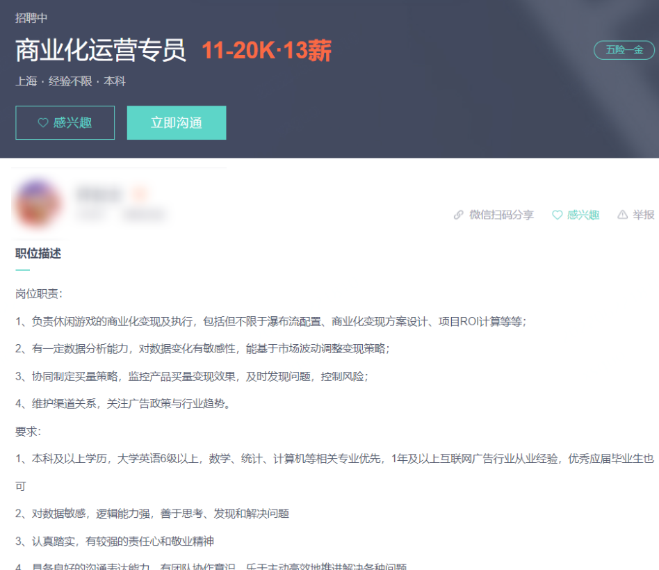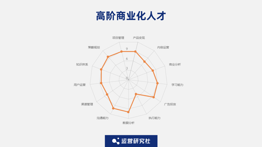 不難發(fā)現(xiàn),越是高階商業(yè)化運(yùn)營(yíng),市場(chǎng)對(duì)其數(shù)據(jù)分析、商業(yè)化思維、變現(xiàn)能力等技能的要求就越高。
